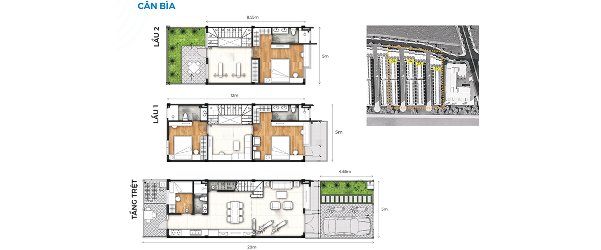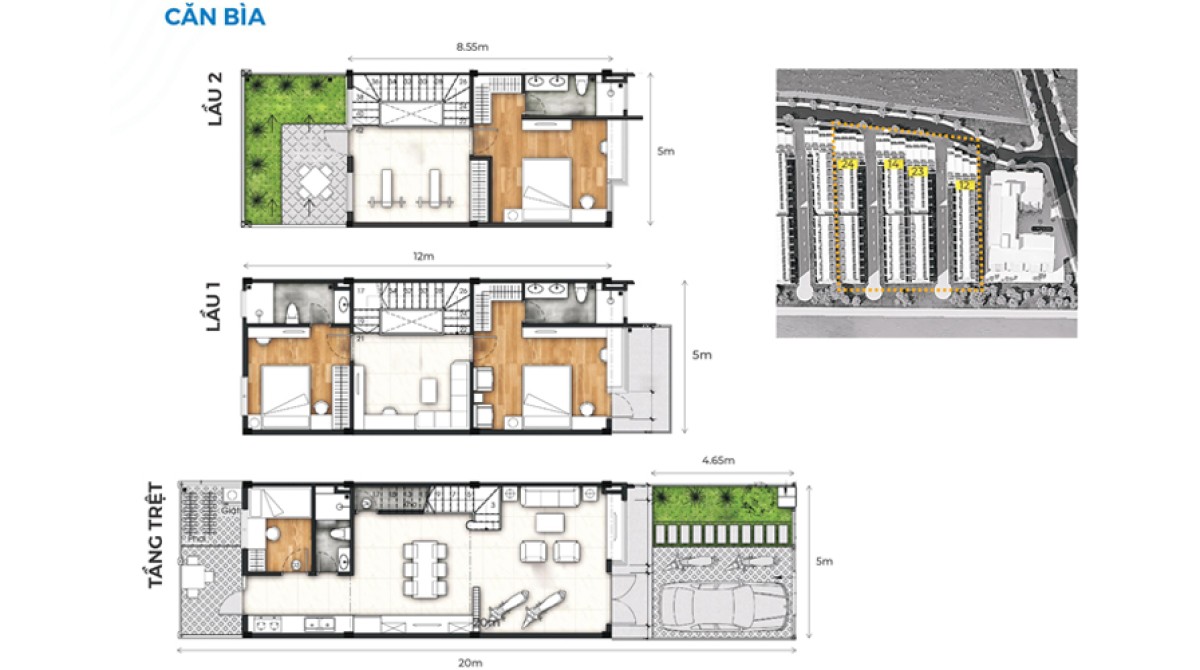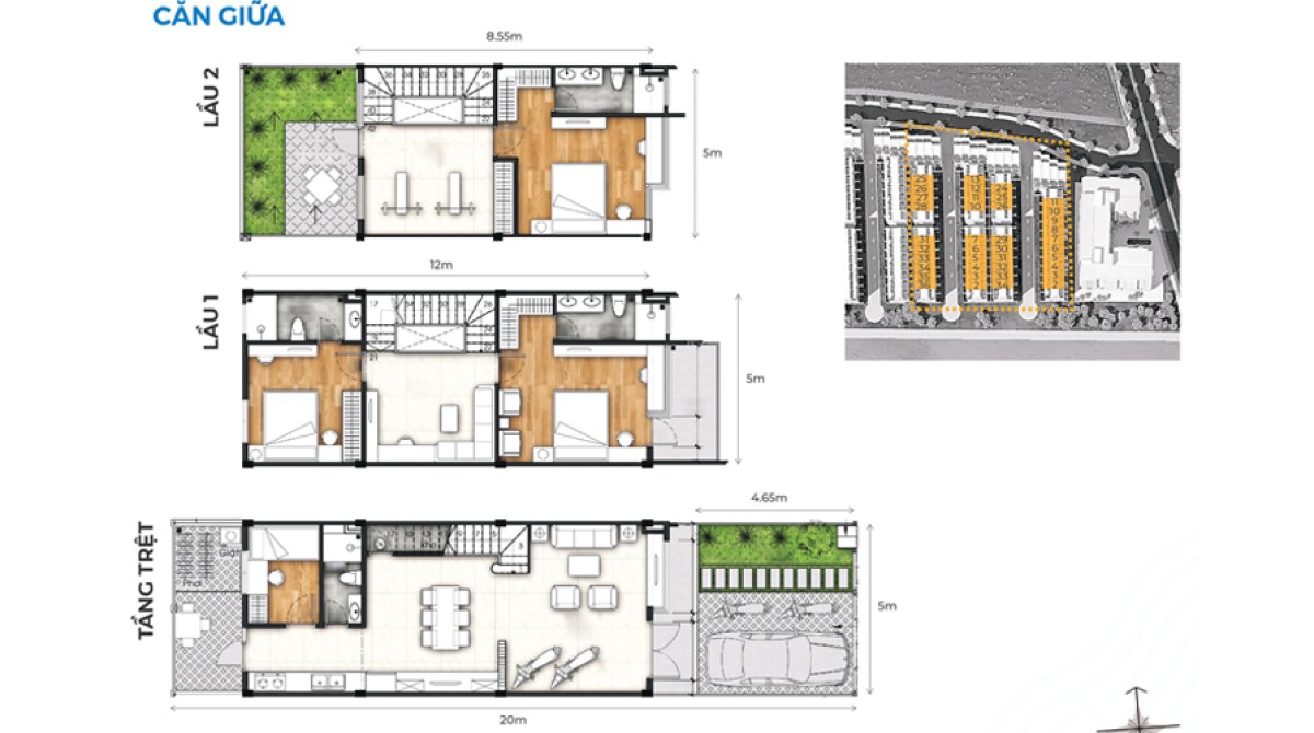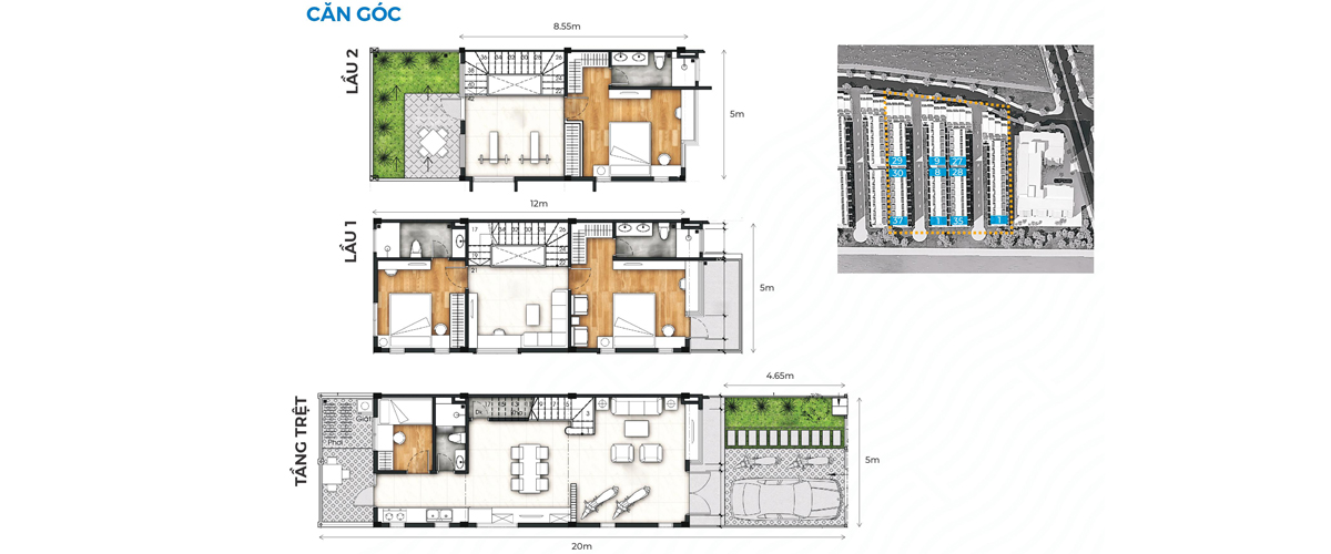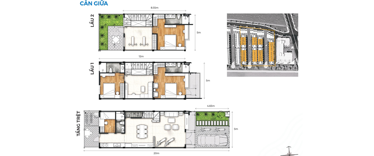 - Diện tích: 5x20 thiết kế 1 trệt 2 lầu